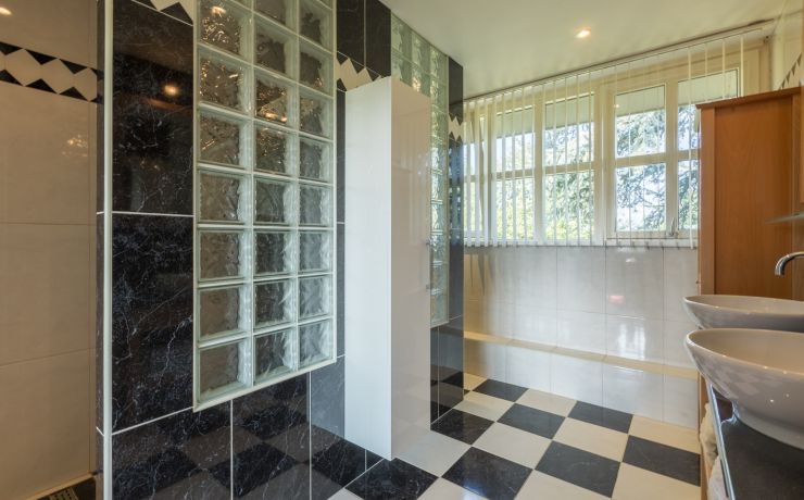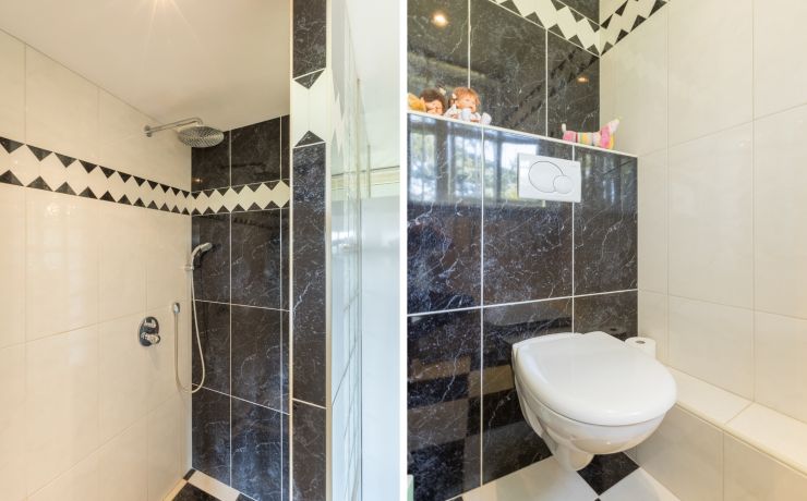 1e Verdieping: overloop, 3 slaapkamers waarvan één met openslaande deuren naar het balkon en 2 inbouwkasten. Badkamer met inloopdouche, toilet en 2 wastafels.