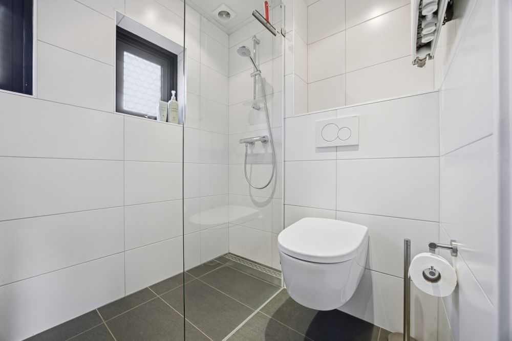 Eerste verdieping: overloop, drie slaapkamers, waarvan één met schuifpui naar het balkon en twee met wastafel en vaste kast. Badkamer met wastafel, inloopdouche en toilet.
